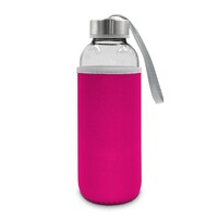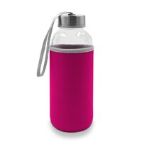 Butelka 420 ml, posiada zakrętkę w srebrnym kolorze oraz uchwyt ułatwiający noszenie, kolorowy pokrowiec w komplecie, produkt wykonany ze szkła i stali nierdzewnej