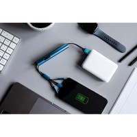 Kabel do ładowania z 4 końcówkami: USB, micro USB, USB-C oraz kompatybilną z urządzeniami iOS, co umożliwia jednoczesne ładowanie kilku urządzeń o różnych złączach, końcówka USB-C z funkcją transferu danych, długość kabla: 28 cm, obudowa kabla posiada dużą powierzchnię, która może zostać oznakowana i być nośnikiem logotypu lub hasła marketingowego, produkt wykonany z metalu i ABS