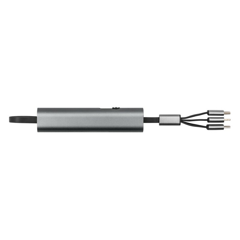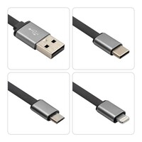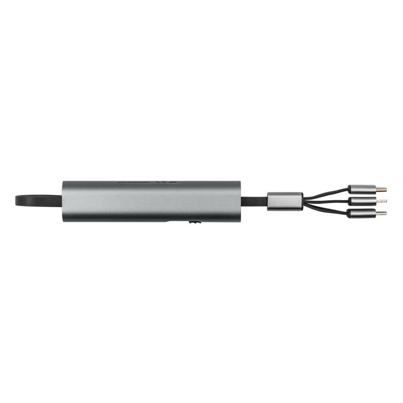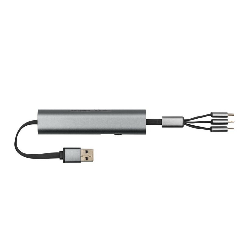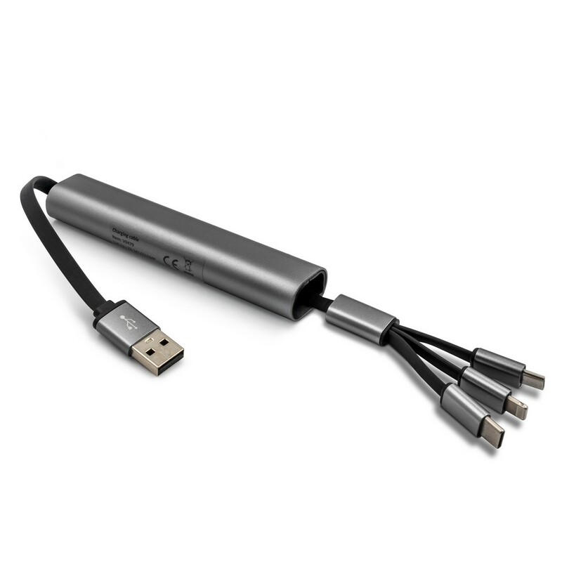 Kabel do ładowania z 4 końcówkami: USB, micro USB, USB-C oraz kompatybilną z urządzeniami iOS, co umożliwia jednoczesne ładowanie kilku urządzeń o różnych złączach, końcówka USB-C z funkcją transferu danych, długość kabla: 28 cm, obudowa kabla posiada dużą powierzchnię, która może zostać oznakowana i być nośnikiem logotypu lub hasła marketingowego, produkt wykonany z metalu i ABS
