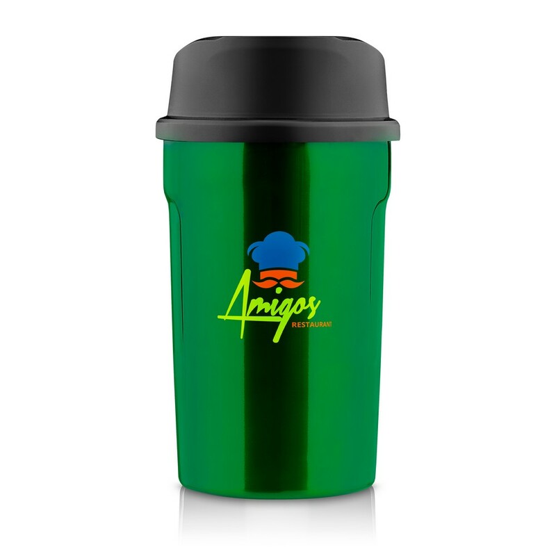 Kubek termiczny 400 ml Air Gifts, posiada podwójne ścianki ze stali nierdzewnej z miedzianą izolacją próżniową, co spowalnia oddawanie temperatury na zewnątrz, zachowując funkcje termosu, plastikowe wieczko z przyciskiem otwarcia/zamknięcia ustnika umożliwiającym obsługę jedną ręką, błyszczące wykończenie, utrzymuje temperaturę napojów gorących do 15 godzin +leakproof