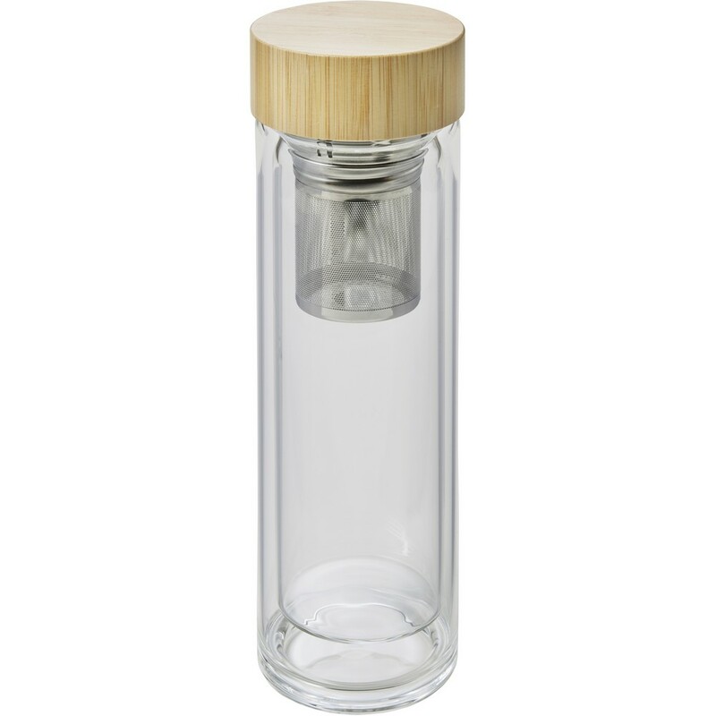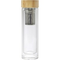 Szklany termos 420 ml, posiada wyjmowane sitko zatrzymujące fusy, bambusowa zakrętka, podwójne ścianki, utrzymuje temperaturę napojów gorących do 4 godzin +leakproof