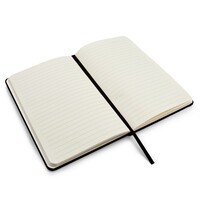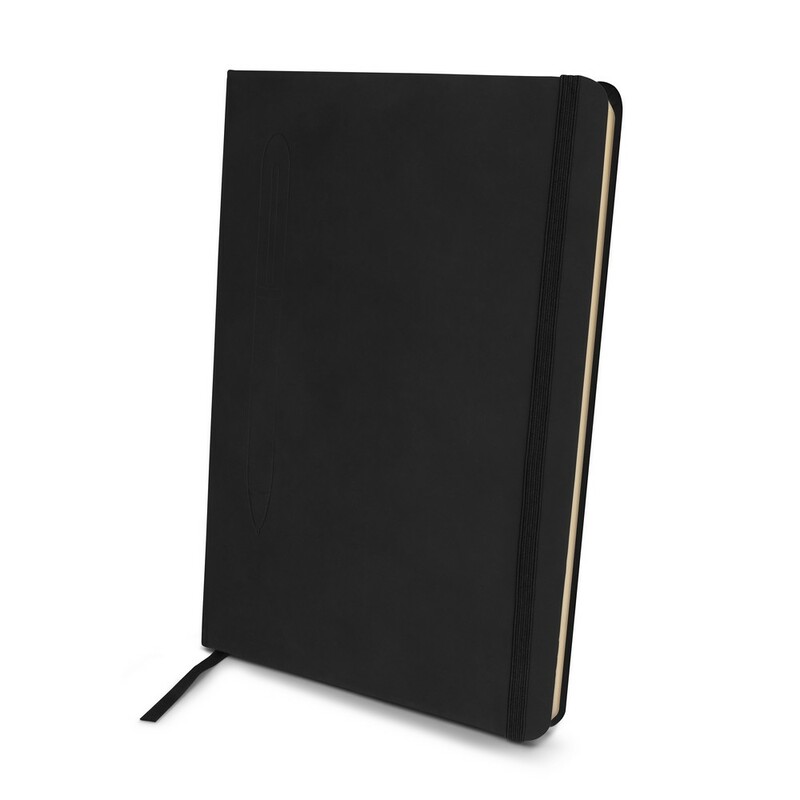 Notatnik A5 (80 kartek w linie), twarda okładka z PU z wbudowanym magnesem umożliwiającym przyczepienie przyborów do pisania (nie dołączone), tasiemka zakładkowa i elastyczna opaska do zamykania