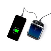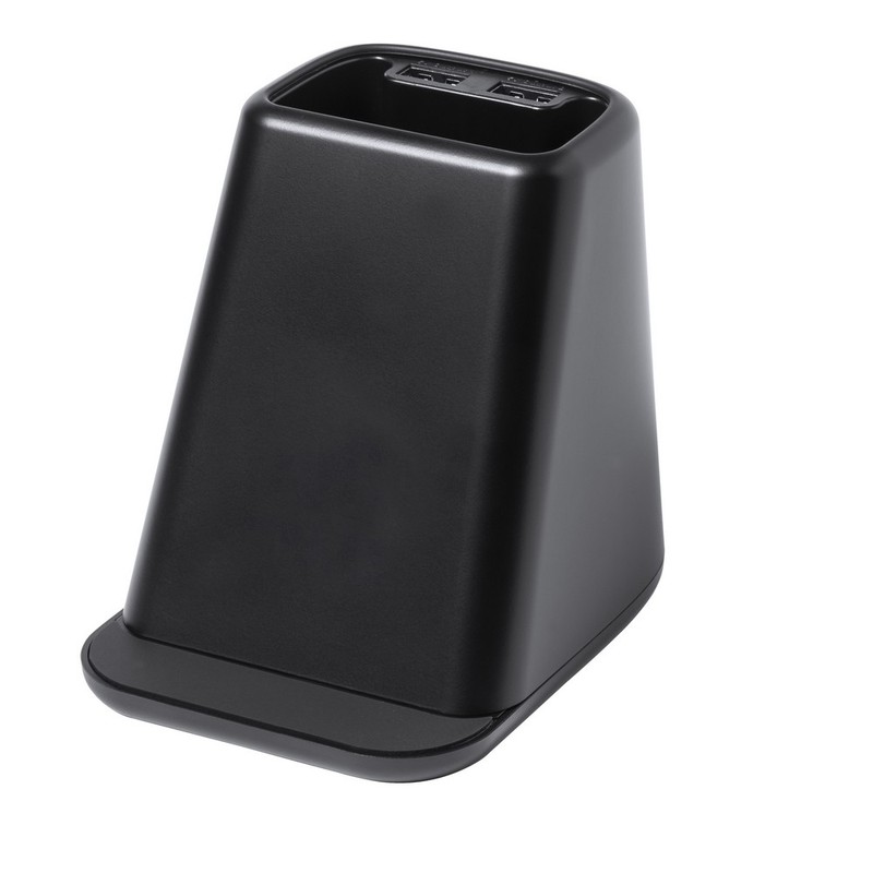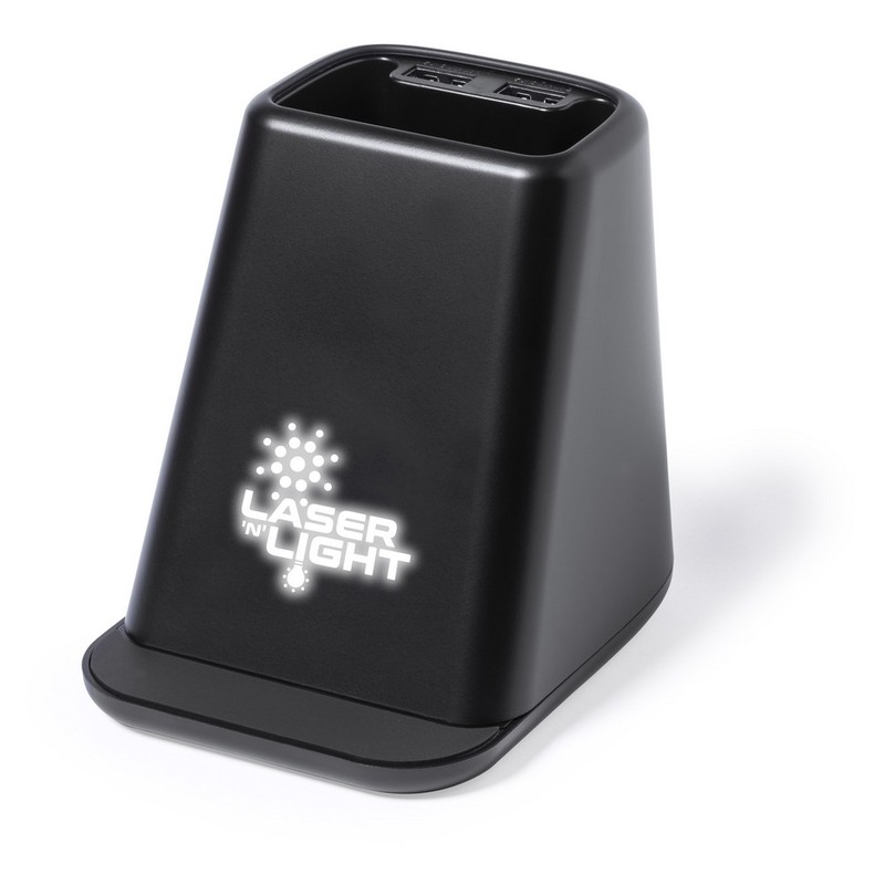 Ładowarka bezprzewodowa 15W, działa z telefonami posiadającymi możliwość ładowania indukcyjnego, 2 wyjścia USB 5V/2A, pojemnik na przybory do pisania, stojak na telefon, grawer ukazuje podświetlaną powierzchnię, antypoślizgowy spód, wejście USB typu C 5-12V/3-1.5A, kabel USB typu C w komplecie