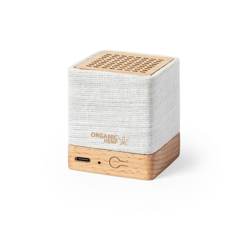 Głośnik bezprzewodowy BT 5.0 3W, wykonany z materiału z konopi organicznej i drewna, bateria 300 mAh, zasięg do 10 m, ładowany przez USB, wejście USB typu C, kabel USB typu C w komplecie