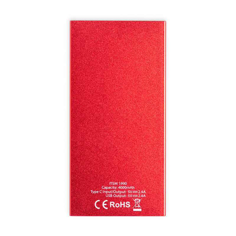 Power bank 4000 mAh wykonany z aluminium z recyklingu, 4 diody wskazujące poziom naładowania, wejście/wyjście USB typu C 5V/2.4A, 2 wyjścia USB 5V/2.4A, kabel USB typu C w komplecie