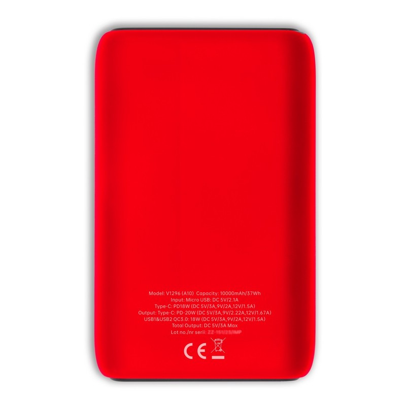 Power bank 10000 mAh, 4 diody wskazujące poziom naładowania, gumowana obudowa, wejście micro USB oraz USB-C (18W), 2 wyjścia USB (18W), wyjście USB-C (20W), możliwość ładowania trzech urządzeń jednocześnie, kabel USB-C w komplecie