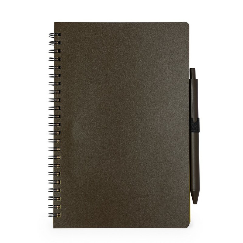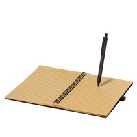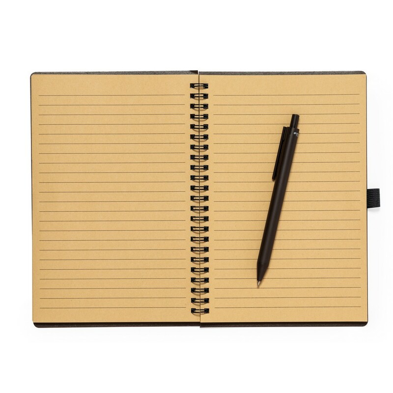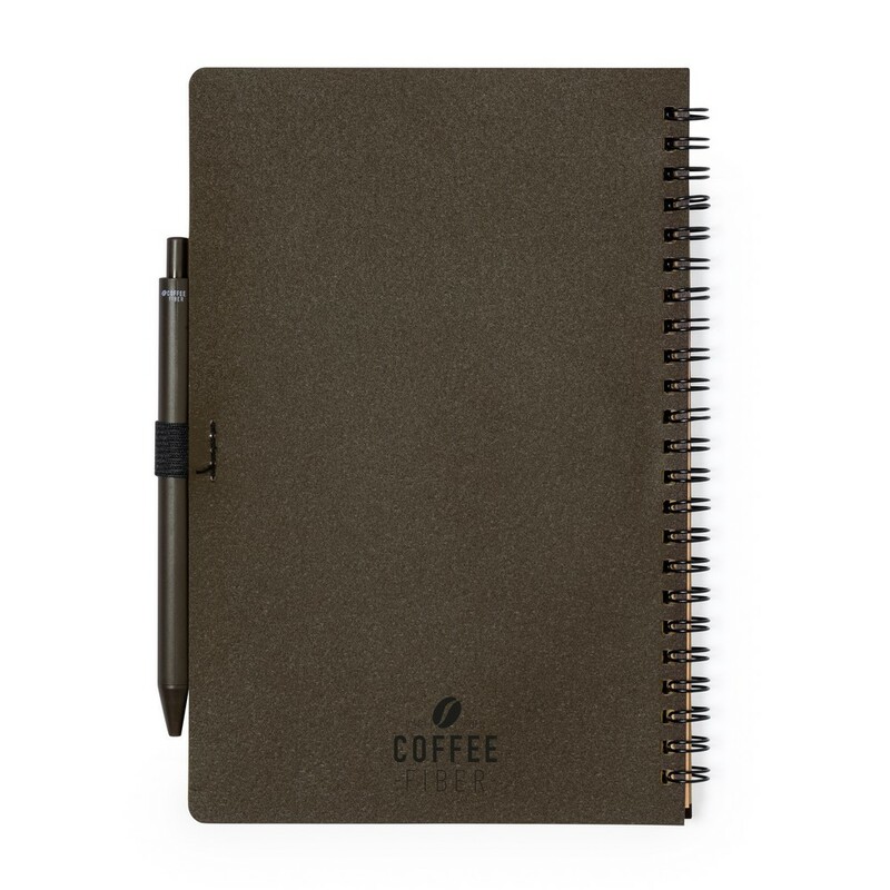 Notatnik A5 (80 kartek w linie), miękka okładka wykonana z łusek kawowych, spiralne bindowanie, długopis z trzonem z łusek kawowych w komplecie, wkład długopisu w niebieskim kolorze