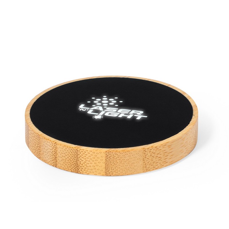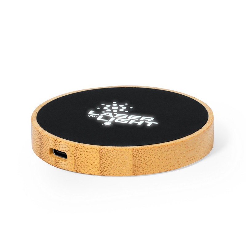 Bambusowa ładowarka bezprzewodowa 15W, grawer ukazuje podświetlaną powierzchnię, działa z urządzeniami posiadającymi możliwość ładowania indukcyjnego, wejście USB-C 5-9V/1.5-2A, antypoślizgowy spód, kabel USB-C w komplecie
