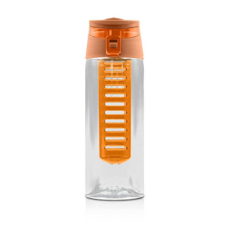 Butelka sportowa 700 ml Air Gifts, posiada pojemnik na lód lub owoce umożliwiający nadanie wodzie smaku według własnych preferencji, kolorowa zakrętka ze składanym uchwytem ułatwiającym noszenie, butelka przeznaczona wyłącznie do zimnych i niegazowanych napojów, produkt wykonany z plastiku