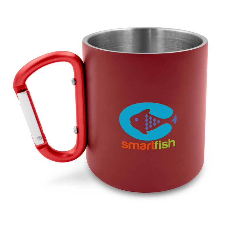 Kubek 280 ml z karabińczykiem, wykonany ze stali nierdzewnej z recyklingu, podwójne ścianki