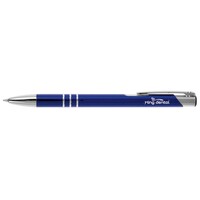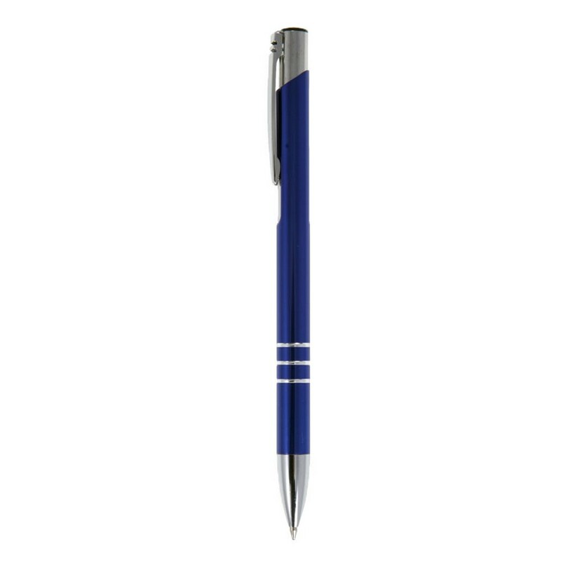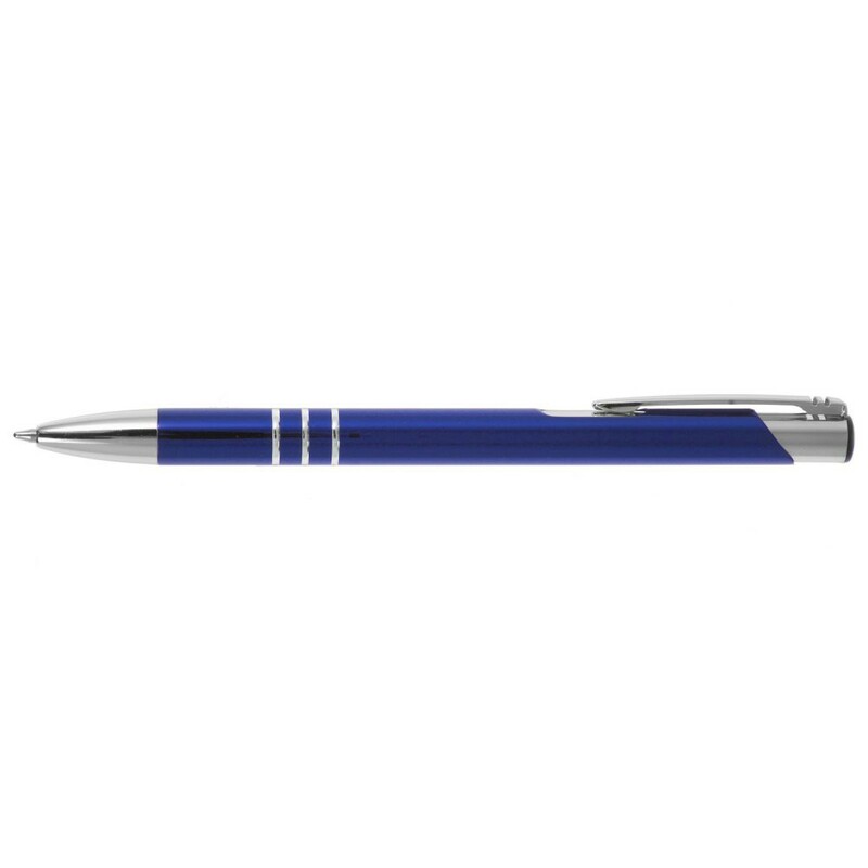 Długopis z kolorowym trzonem o błyszczącym wykończeniu, posiada elementy w srebrnym kolorze, wkład w niebieskim kolorze, produkt wykonany z aluminium