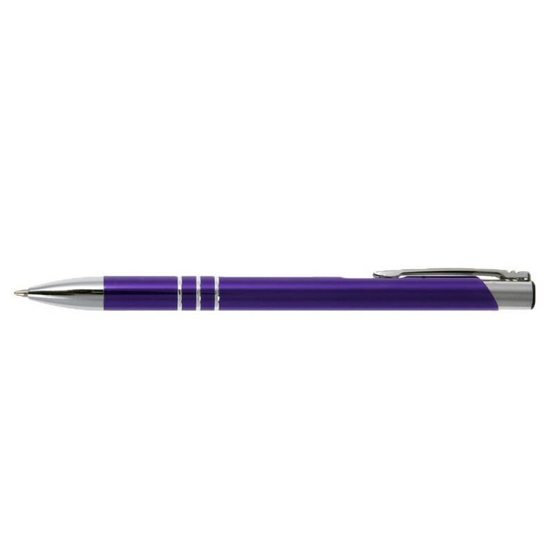 Długopis z kolorowym trzonem o błyszczącym wykończeniu, posiada elementy w srebrnym kolorze, wkład w niebieskim kolorze, produkt wykonany z aluminium