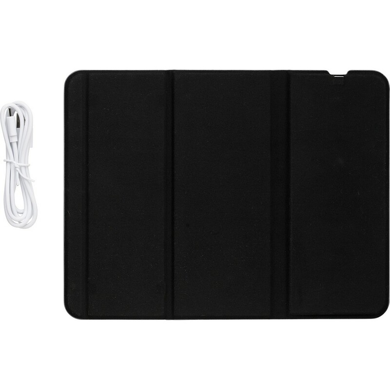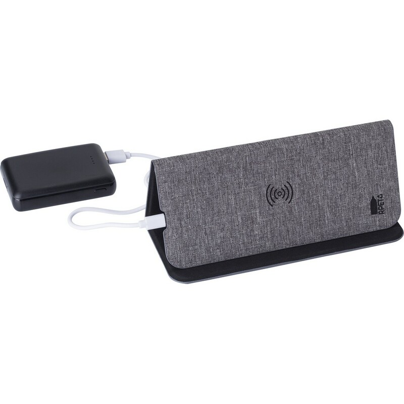 Podkładka pod mysz wykonana z poliestru RPET, ładowarka bezprzewodowa 10W, działa z telefonami posiadającymi możliwość ładowania indukcyjnego, stojak na telefon