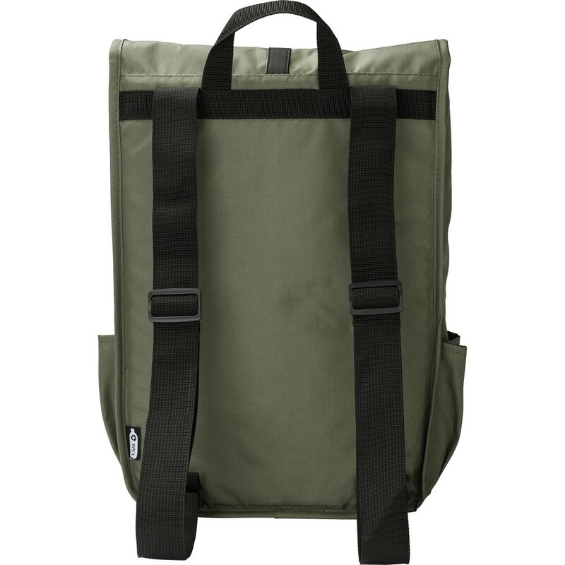 Plecak z klapą wykonany z RPET, dwie kieszenie boczne, przestronna przegroda główna, zamykany na klamrę