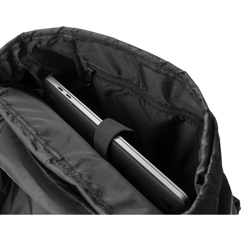 Plecak z klapą wykonany z RPET, dwie kieszenie boczne, przednia kieszeń zamykana na magnes, wnętrze zamykane na sznurek, kieszeń na laptopa 15", wodoodporna powłoka na torbie