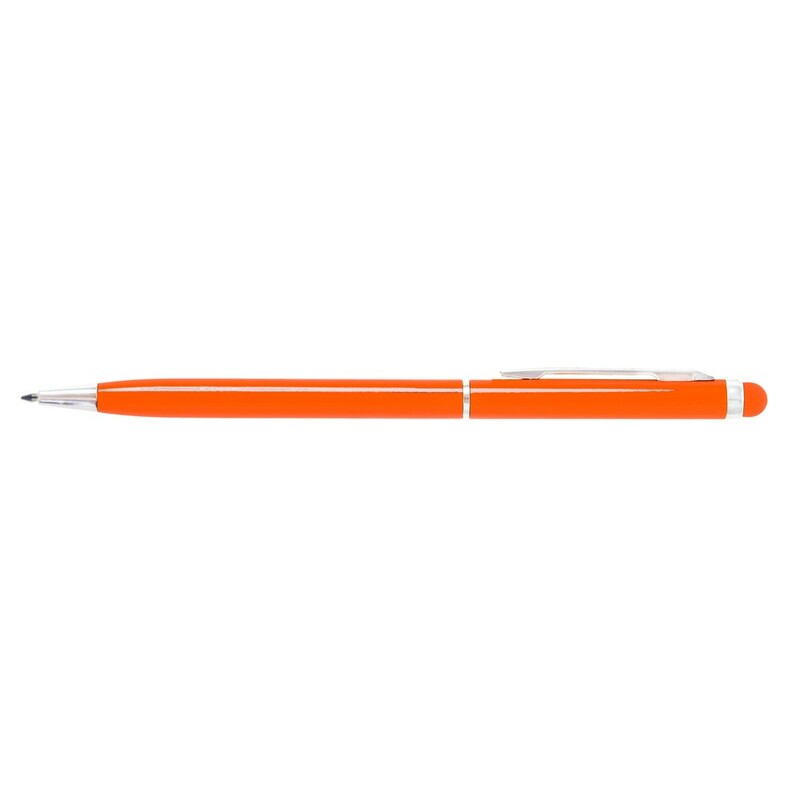Długopis z kolorowym trzonem o błyszczącym wykończeniu, niewielka średnica nadaje nowoczesnego wyglądu, dopasowana kolorystycznie końcówka touch pen umożliwiająca obsługę ekranów dotykowych, wkład w niebieskim kolorze, produkt wykonany z aluminium