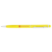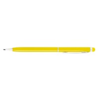Długopis z kolorowym trzonem o błyszczącym wykończeniu, niewielka średnica nadaje nowoczesnego wyglądu, dopasowana kolorystycznie końcówka touch pen umożliwiająca obsługę ekranów dotykowych, wkład w niebieskim kolorze, produkt wykonany z aluminium