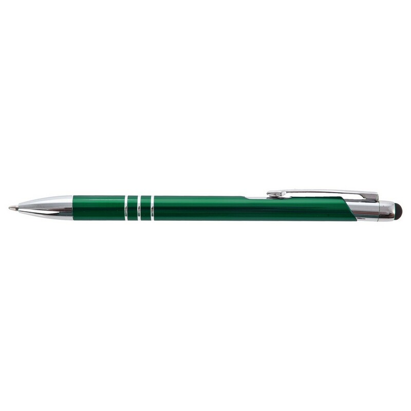 Długopis z kolorowym trzonem o błyszczącym wykończeniu, posiada elementy w kolorze srebrnym, końcówka touch pen umożliwiająca obsługę ekranów dotykowych, wkład w niebieskim kolorze, produkt wykonany z aluminium