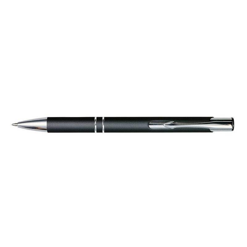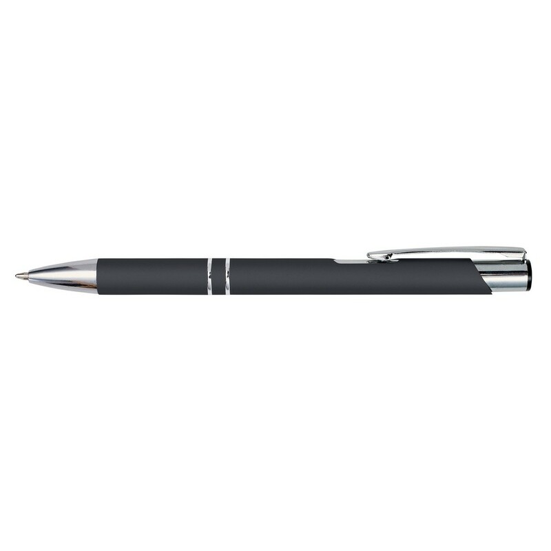 Długopis z gumowanym wykończeniem i srebrnymi elementami, grawer ukazuje lustrzaną powierzchnię