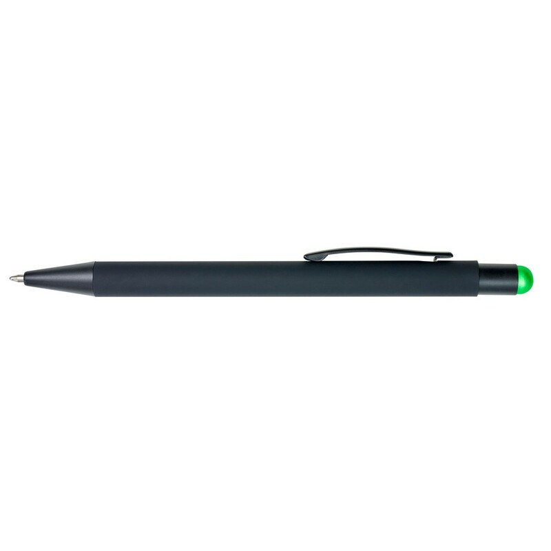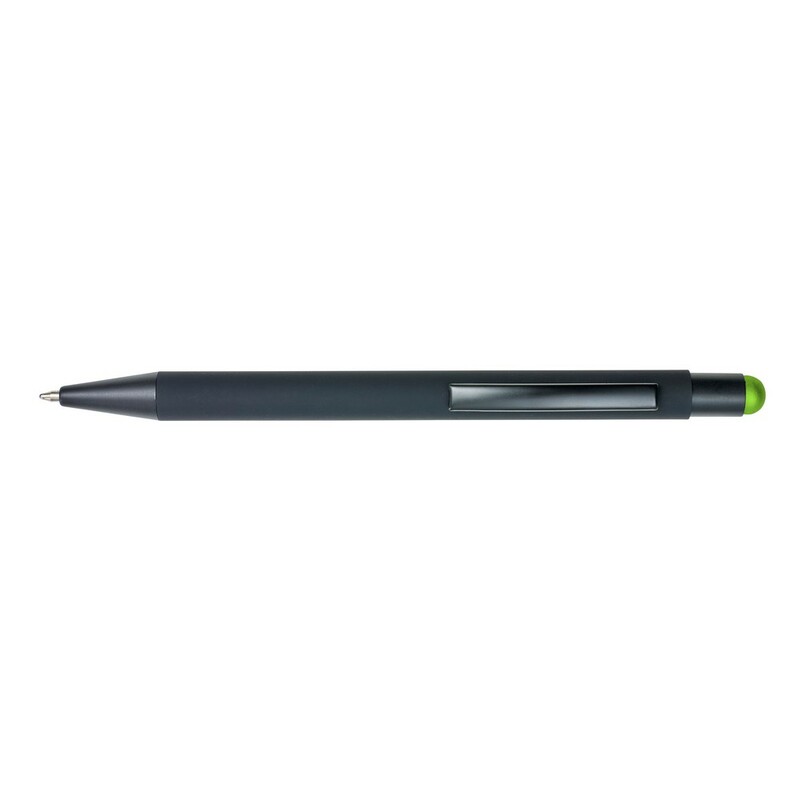 Długopis, touch pen z gumowanym wykończeniem, grawer ukazuje powierzchnię w kolorze zbliżonym do koloru gumowej końcówki lub w kolorze białym