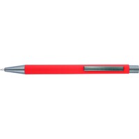 Długopis z kolorowym, gumowanym trzonem i szarymi elementami, grawer ukazuje lustrzaną powierzchnię