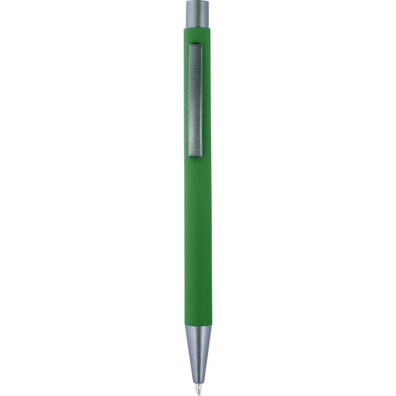 Długopis z kolorowym, gumowanym trzonem i szarymi elementami, grawer ukazuje lustrzaną powierzchnię