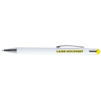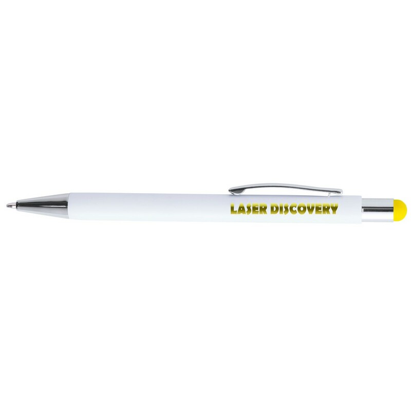 Długopis, touch pen, biały trzon, matowe wykończenie, grawer ukazuje lustrzaną powierzchnię w kolorze zbliżonym do gumowej końcówki
