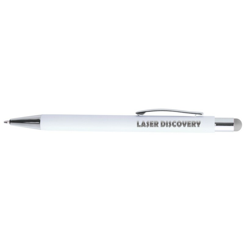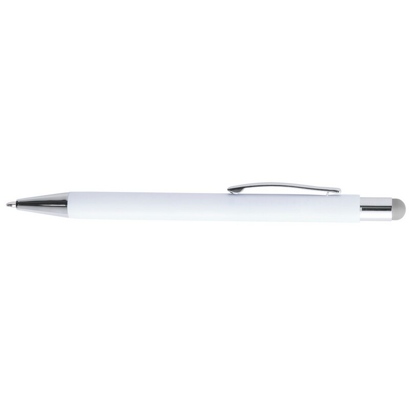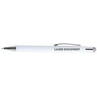 Długopis, touch pen, biały trzon, matowe wykończenie, grawer ukazuje lustrzaną powierzchnię w kolorze zbliżonym do gumowej końcówki