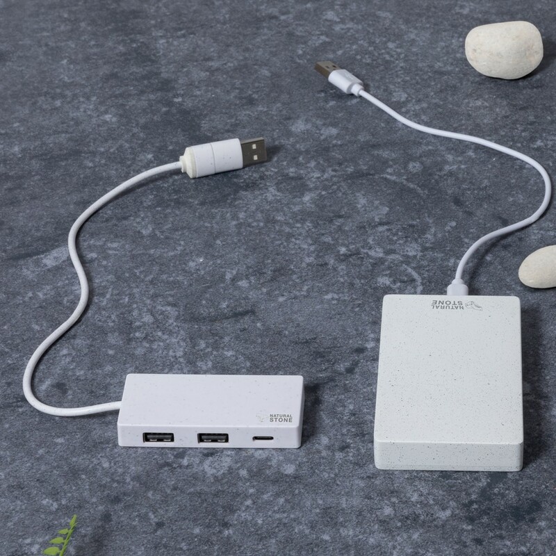 Power bank 5000 mAh wykonany z ekstraktu z kamienia, 4 diody wskazujące poziom naładowania, możliwość ładowania trzech urządzeń jednocześnie, 2 wyjścia USB 5V/2.4A, wejście/wyjście USB-C 5V/2.4A, kabel USB-C w komplecie
