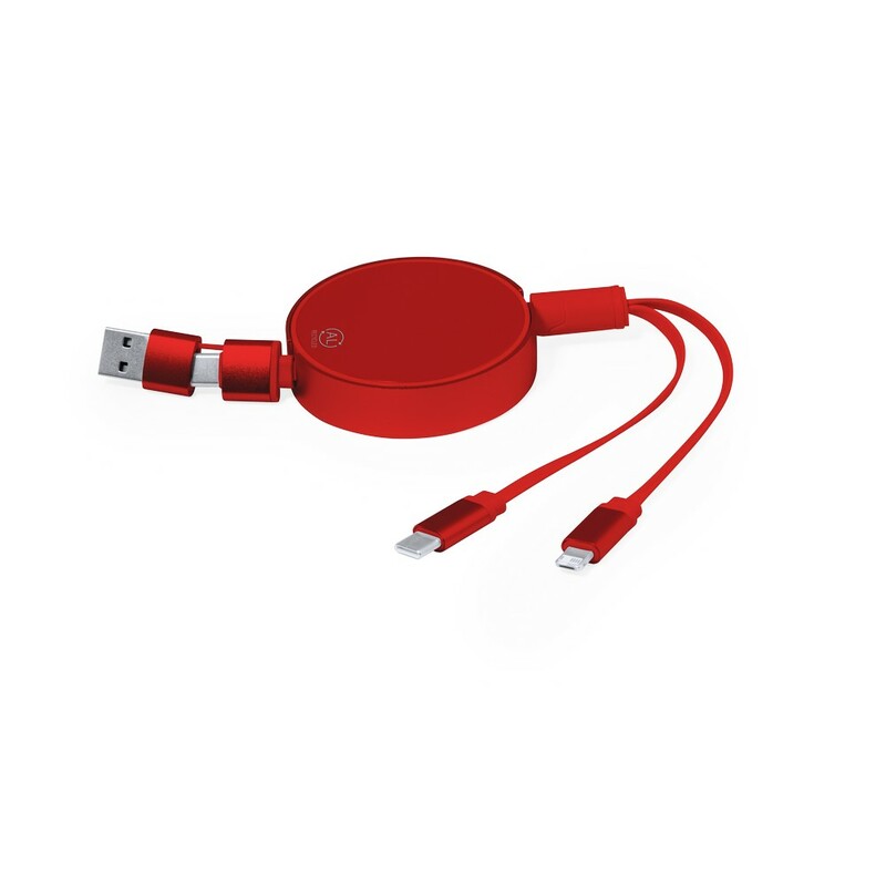 Kabel do ładowania i synchronizacji wykonany z aluminium z recyklingu z 4 końcówkami: USB, 2x USB-C oraz końcówką 2 w 1 (micro USB oraz kompatybilną z urządzeniami iOS), 5V/2.4A, zwijany, zgodny z certyfikatem GRS (Global RecycIed Standard)