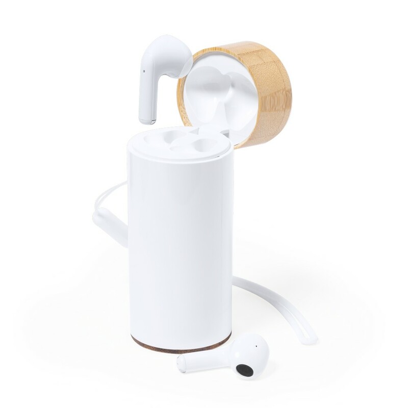 Power bank 4500 mAh, bezprzewodowe słuchawki douszne, BT 5.0, bateria słuchawek 30 mAh, elementy z bambusa, możliwość ładowania dwóch urządzeń jednocześnie, wyjście USB 5V/2.4A, wejście/wyjście USB-C 5V/2.4A, zintegrowany kabel w komplecie