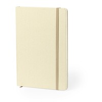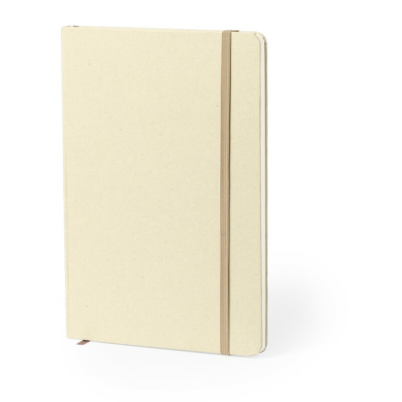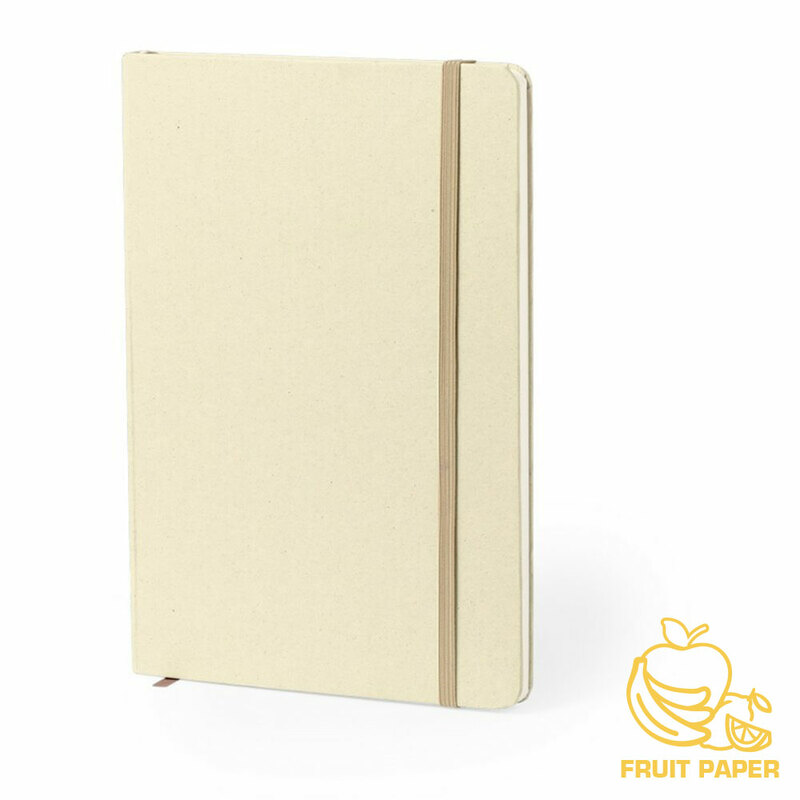 Notatnik A5 (80 kartek w linie), wykonany z kartonu z recyklingu i papieru z owoców, twarda okładka, tasiemka zakładkowa i elastyczna opaska do zamykania