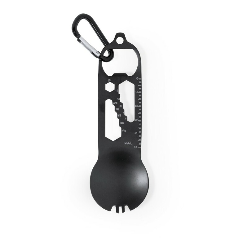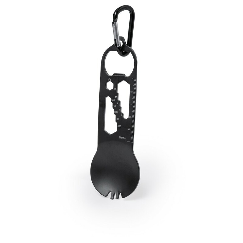 Narzędzie wielofunkcyjne, 16 funkcji, otwieracz do butelek, linijka, łyżka, widelec, klucz, karabińczyk w komplecie