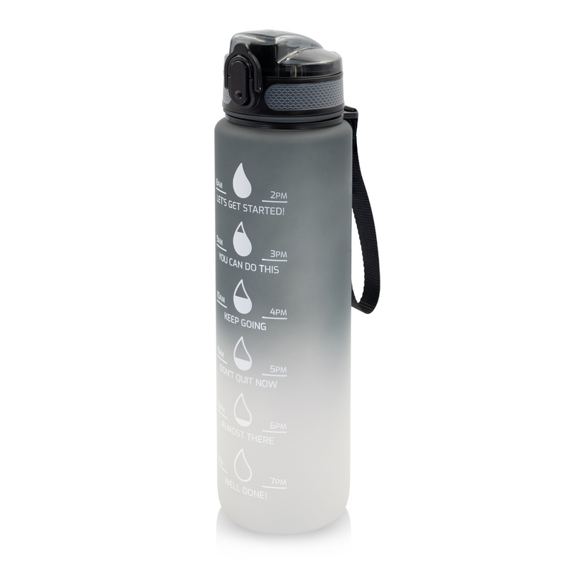 Butelka motywacyjna 1000 ml Air Gifts, skala ml z jednej strony i podziałka motywacyjna z drugiej strony, zamknięcie z blokadą, pasek na rękę (pakowany oddzielnie), gumowane wykończenie, przeznaczona wyłącznie do zimnych i niegazowanych napojów