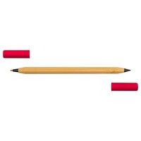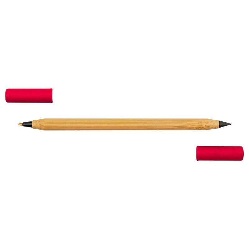 Długopis 2 w 1, "wieczny" ołówek, dzięki wykorzystaniu specjalnej wolnościerającej się końcówki długość pisania ołówka to około 1500 metrów, naostrzony, bambusowy trzon, dwie kolorowe zatyczki wykonane z papieru
