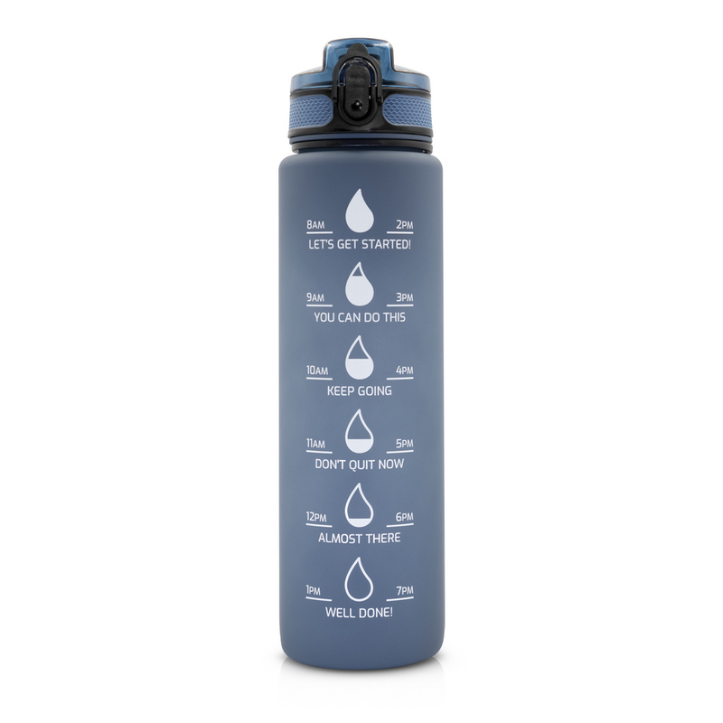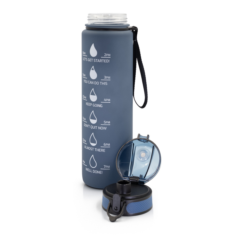 Butelka motywacyjna 1000 ml, skala ml z jednej strony i podziałka motywacyjna z drugiej strony, zamknięcie z blokadą, pasek na rękę (pakowany oddzielnie), gumowane wykończenie, przeznaczona wyłącznie do zimnych i niegazowanych napojów