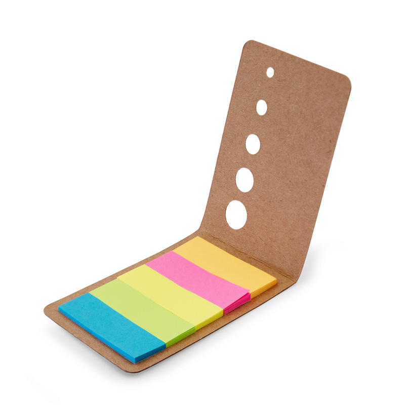 Zestaw karteczek samoprzylepnych, 5 kolorów po 20 szt. (kolory: pomarańczowy, różowy, żółty, zielony, niebieski), karteczki służą do naklejania na stronach książki, zeszytu albo notesu, produkt wykonany z kartonu i papieru