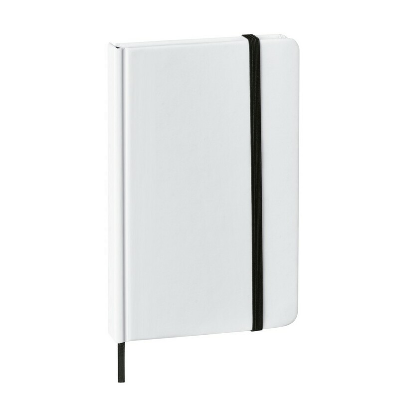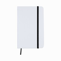 Notatnik (ok. A6, 80 pustych kartek), tasiemka zakładkowa, specjalna okładka pod znakowanie full colour, elastyczna opaska do zamykania