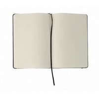 Notatnik w formacie A5, posiada 100 pustych kartek, twarda okładka, tasiemka zakładkowa umożliwia wygodne zaznaczanie ostatniej strony lub ważniejszych notatek, dodatkowe zamknięcie w postaci dopasowanej kolorystycznie elastycznej opaski, produkt wykonany z PU
