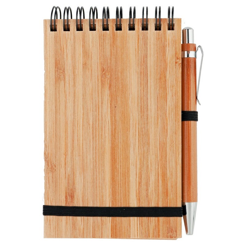Notatnik bambusowy A6 (70 kartek w linie), twarda okładka, długopis z bambusowym trzonem i srebrnymi elementami w komplecie, wkład długopisu w niebieskim kolorze
