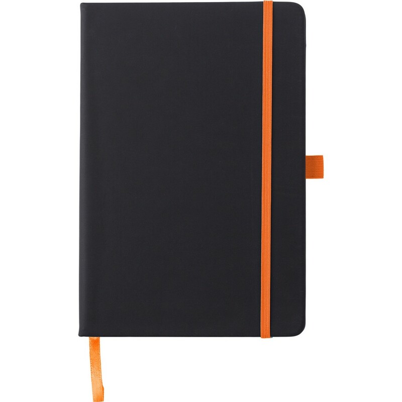 Notatnik (ok. A5, 96 kartek w linie), tasiemka zakładkowa i elastyczna opaska do zamykania, grawer ukazuje powierzchnię w kolorze opaski do zamykania