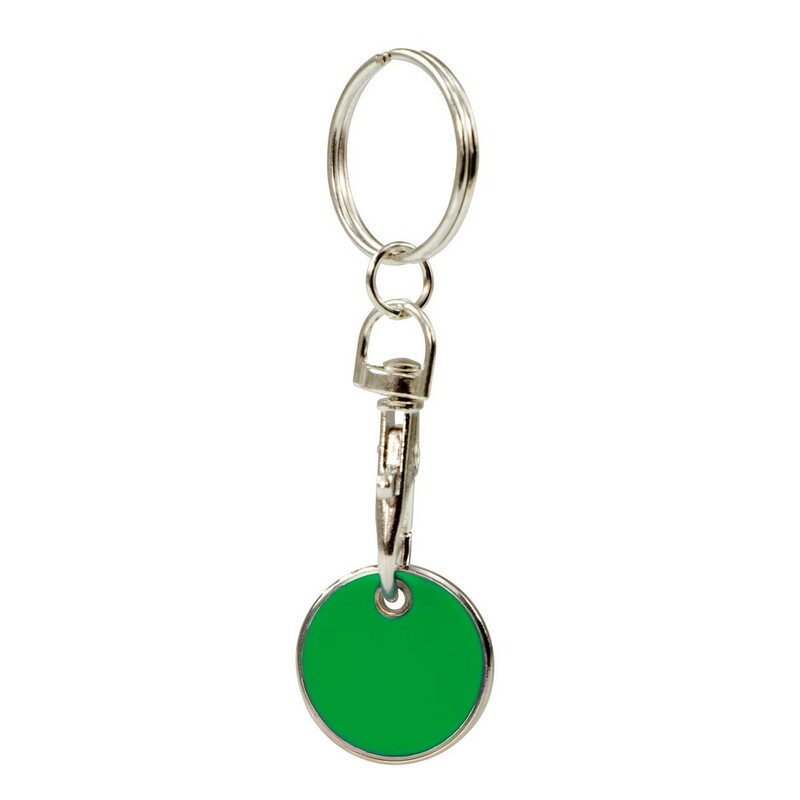 Brelok do kluczy z karabińczykiem umożliwiającym przypinanie, posiada wyjmowany żeton do wózka na zakupy w rozmiarze 1 zł, produkt wykonany z metalu
