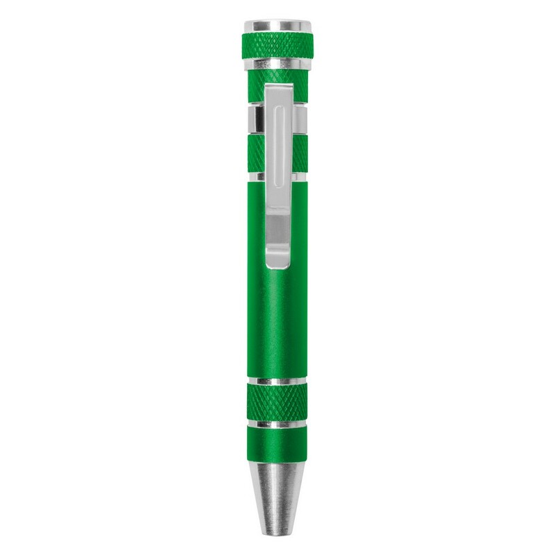 Śrubokręt w kształcie długopisu z 4 płaskimi i 4 krzyżakowymi końcówkami, posiada klip umożliwiający przypinanie, produkt wykonany z aluminium i stali