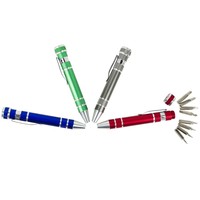Śrubokręt w kształcie długopisu z 4 płaskimi i 4 krzyżakowymi końcówkami, posiada klip umożliwiający przypinanie, produkt wykonany z aluminium i stali