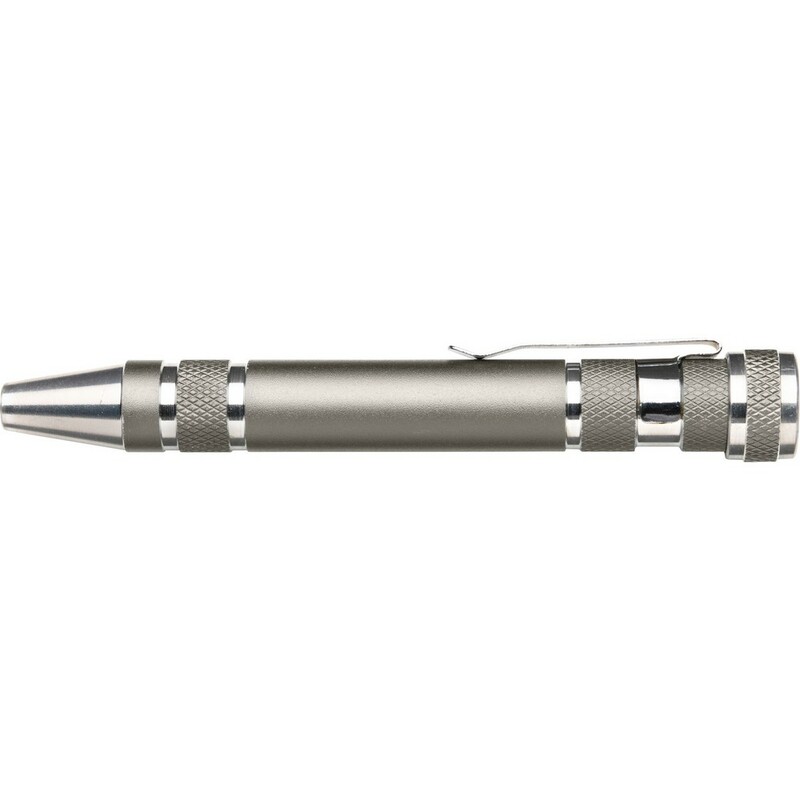 Śrubokręt w kształcie długopisu z 4 płaskimi i 4 krzyżakowymi końcówkami, posiada klip umożliwiający przypinanie, produkt wykonany z aluminium i stali