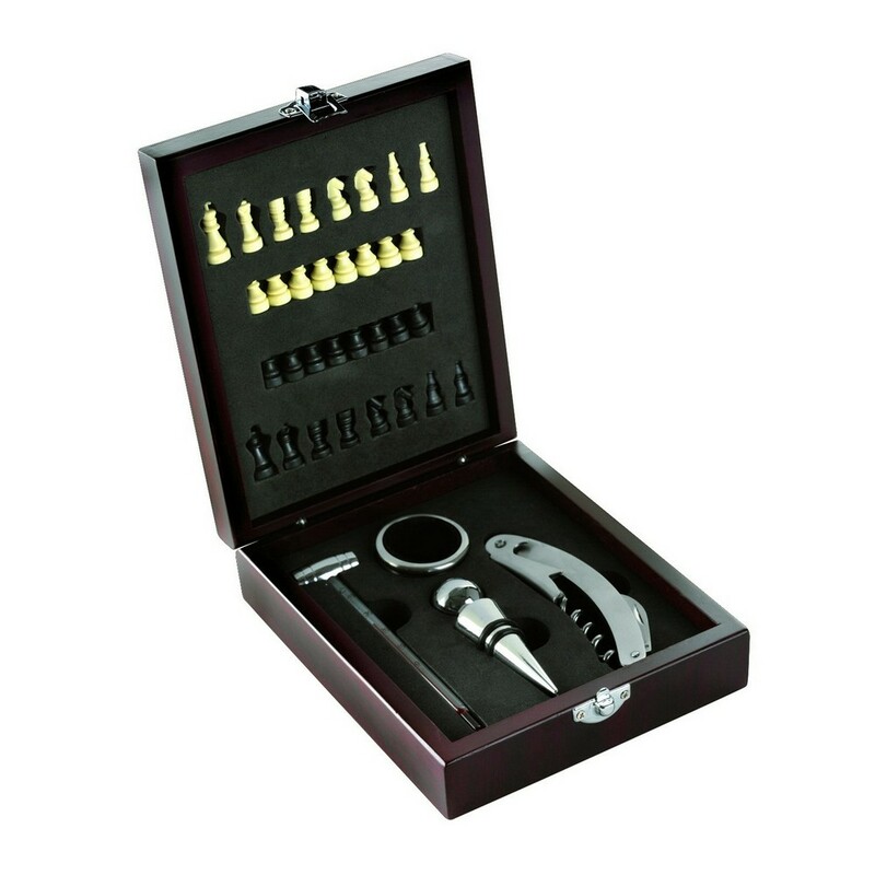 Zestaw do wina, 5 el. w pudełku, szachy i akcesoria do wina: termometr, pierścień, zatyczka, nóż kelnerski
