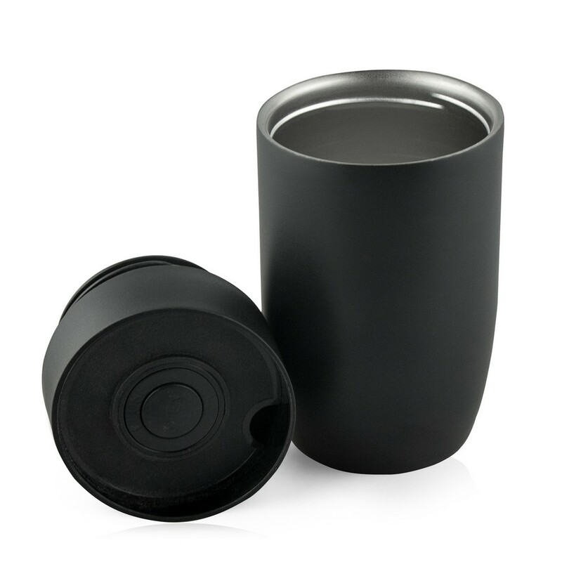 Kubek termiczny 330 ml Air Gifts, posiada podwójne ścianki ze stali nierdzewnej z miedzianą izolacją próżniową, co spowalnia oddawanie temperatury na zewnątrz, zachowując funkcje termosu, plastikowe wieczko z przyciskiem otwarcia/zamknięcia ustnika umożliwiającym obsługę jedną ręką, matowe wykończenie, utrzymuje temperaturę napojów gorących do 15 godzin +leakproof