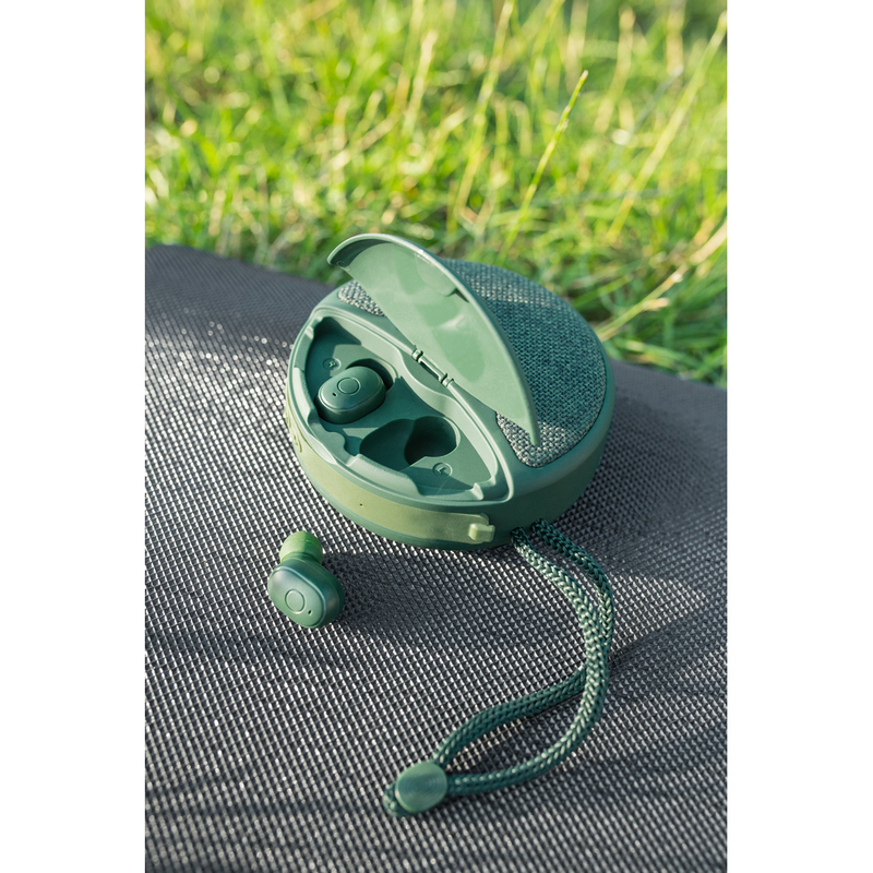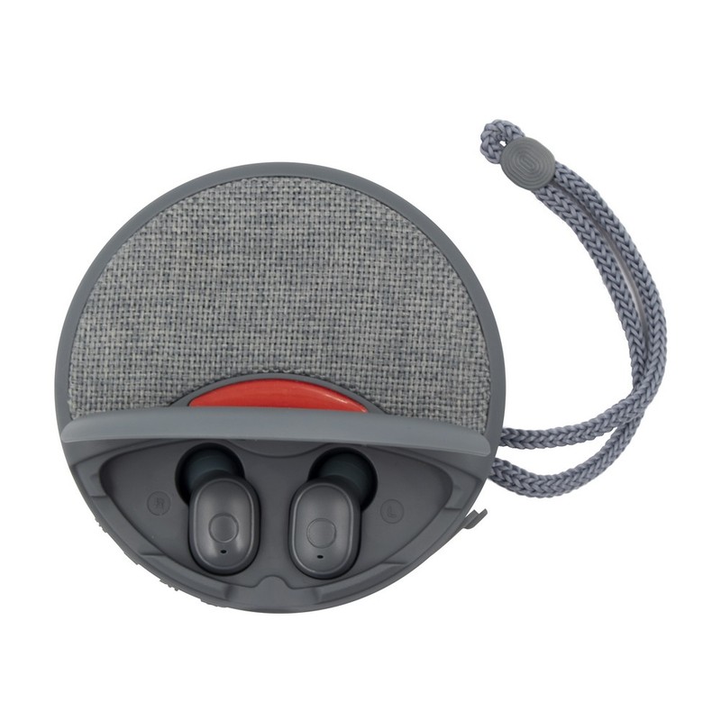 Głośnik bezprzewodowy 5W Air Gifts z bezprzewodowymi słuchawkami dousznymi w komplecie, BT 5.0, posiada radio, czytnik kart TF/micro SD (nie dołączona), słuchawki z funkcją odbierania połączeń, bateria głośnika: 500 mAh, bateria słuchawek: 2x40 mAh, czas pracy słuchawek: ok. 3h, zasięg do 10 m, gniazdo USB, wejście audio, wejście USB-C, ładowany przez USB, kabel USB-C w komplecie