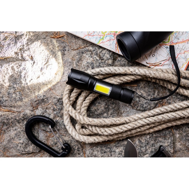 Latarka 1 LED 5W (280 lumenów), z bocznym światłem COB 3W, przycisk ON/OFF, wejście micro USB, ładowana przez USB, 4 tryby świecenia, bateria 1200 mAh, ok. 4h pracy na jednym naładowaniu, pasek na rękę, kabel micro USB w komplecie