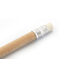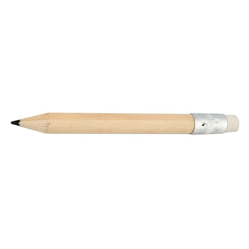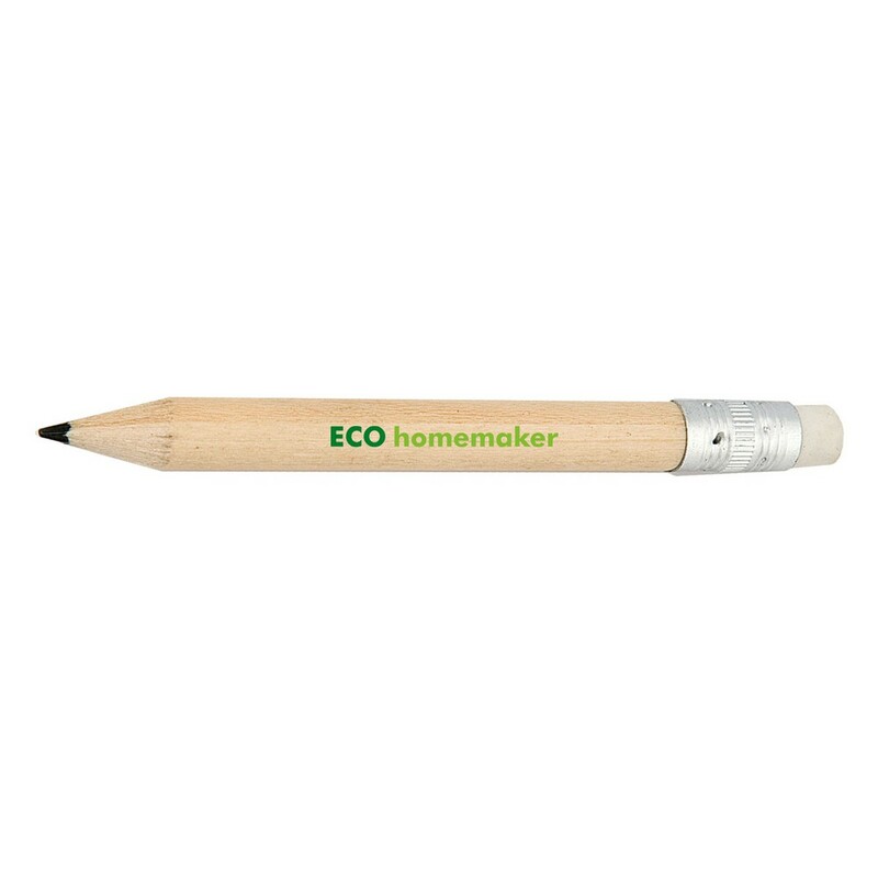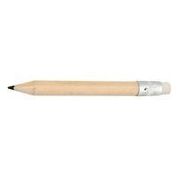 Mini ołówek z gumką, posiada naostrzoną końcówkę, może służyć jako przydatny gadżet dla np. sklepów w branży budowlanej, produkt wykonany z drewna